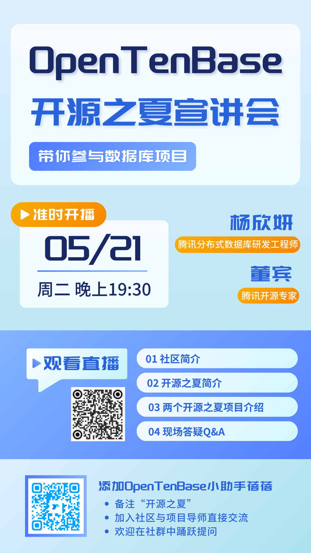 5月21日(周二)19:30-20:30,OpenTenBase开源之夏宣讲会将邀请腾讯分布式数据库研发工程师杨欣妍、腾讯开源专家董宾,介绍OpenTenBase社区和两个开源之夏项目,更设置现场答疑环节,欢迎同学们添加OpenTenBase小助手蓓蓓(微信号:OpenTenBase)进群交流提问,关注参与本次宣讲直播!
