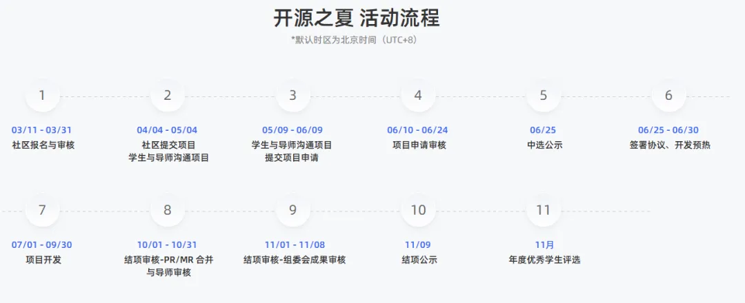 从4月30日起,同学们就可以在系统注册账号并填写个人资料提交审核啦。资料审核通过后,从5月9日起,即可在系统提交项目申请书。6月9日18:00(UTC+8)是报名活动和提交申请书的截止时间。在这期间,你可以尽情挑选心仪的项目,与导师积极沟通,精心准备项目申请材料并提交。每位同学可以申请一个项目,所以一定要慎重选择,全力以赴哦!