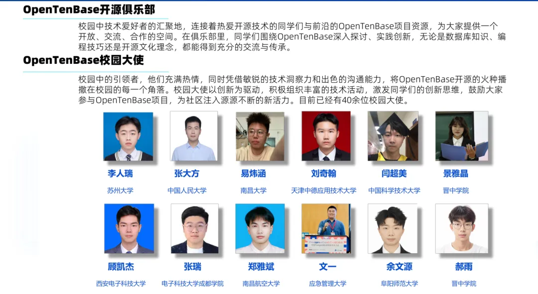 自2023年12月贡献给开放原子开源基金会以来,短短一年时间,OpenTenBase项目已经在社区治理、技术创新和人才培养等方面取得了显著成就,19家企业加入社区委员会,2.6版本发布带来诸多创新特性,在高校发展了40余位校园大使、成立9家开源俱乐部,并在开放原子大赛中获得业界认可。